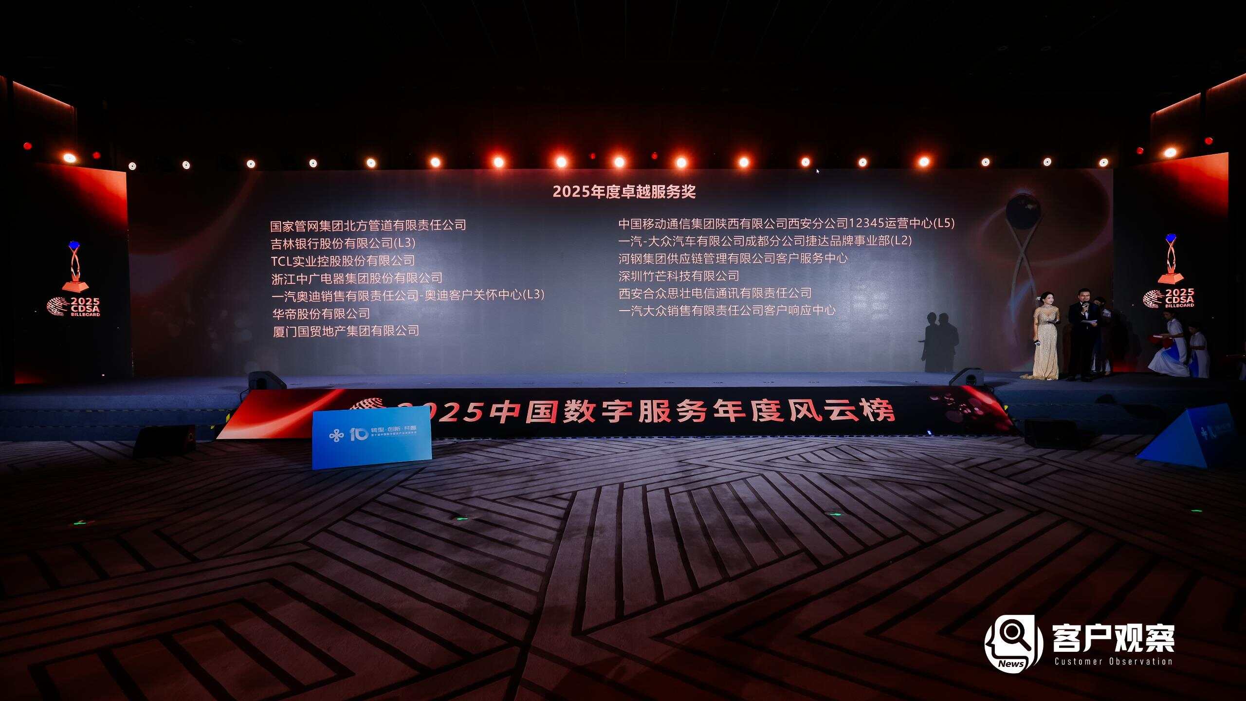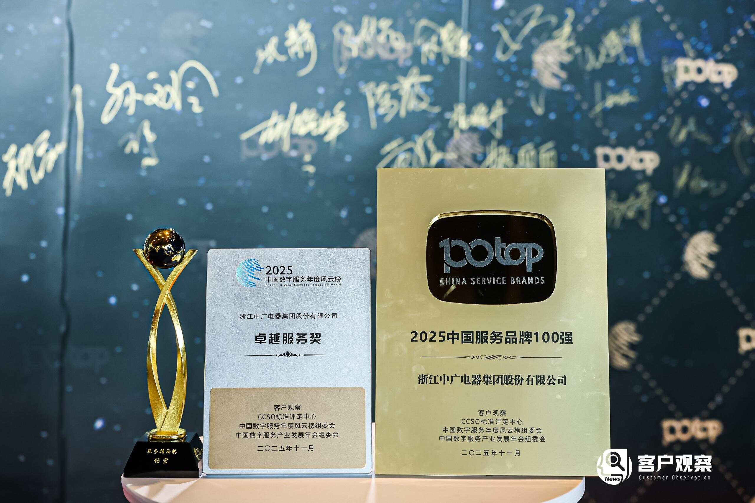 在会议同期举行的颁奖典礼上,中广电器集团凭借出色的服务品质与持续创新能力,一举荣获“中国服务品牌100强”与“卓越服务奖”两项大奖。