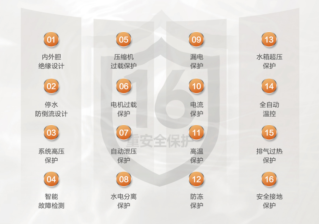 尤其值得一提的是它拥有内外胆绝缘设计、漏电保护、水电分离保护、安全接地保护、压缩机过载保护、水箱超压保护、防冻保护、高温保护、自动泄压保护……16大安全防护系统,筑牢了安全防线,也可有效延长机组使用寿命。