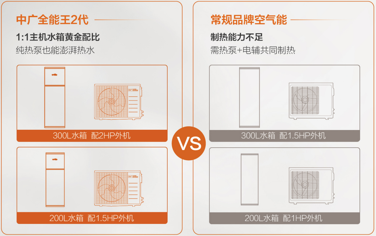在维持优质性能与品质的前提下,中广全能王2代的外机壳体优化焕新,可适配更多的极限安装空间。外机整机6年包修,水箱6年包换*,还拥有150L、200L和300L三档水量可供选择,让用户选择更省心,使用更无忧。