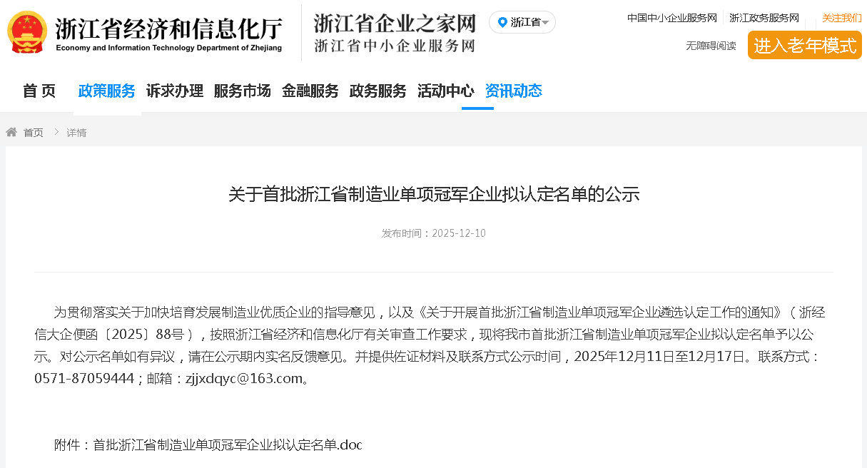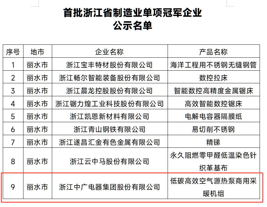 2025年12月10日,浙江省经济和信息化厅发布了《关于首批浙江省制造业单项冠军企业拟认定名单的公示》的通知公告,中广电器集团凭借“低碳高效空气源热泵商用采暖机组”(又称“空气能”),成功入选首批浙江省制造业单项冠军企业(丽水市)拟认定名单(以下简称“单项冠军名单”)。
