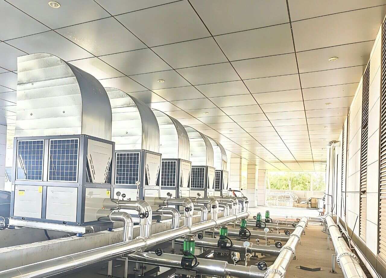 该项目位于鄂尔多斯东胜区鄂尔多斯高新技术产业开发区品澳园区内,2024年,中广为其陆续安装了39台60HP和6台30HP的商用热泵热水(又称“空气能热水”)机组。该项目于2025年6月投入使用,每日出水量达1020吨,充分满足园区内宿舍、食堂等场所的生活热水需求。