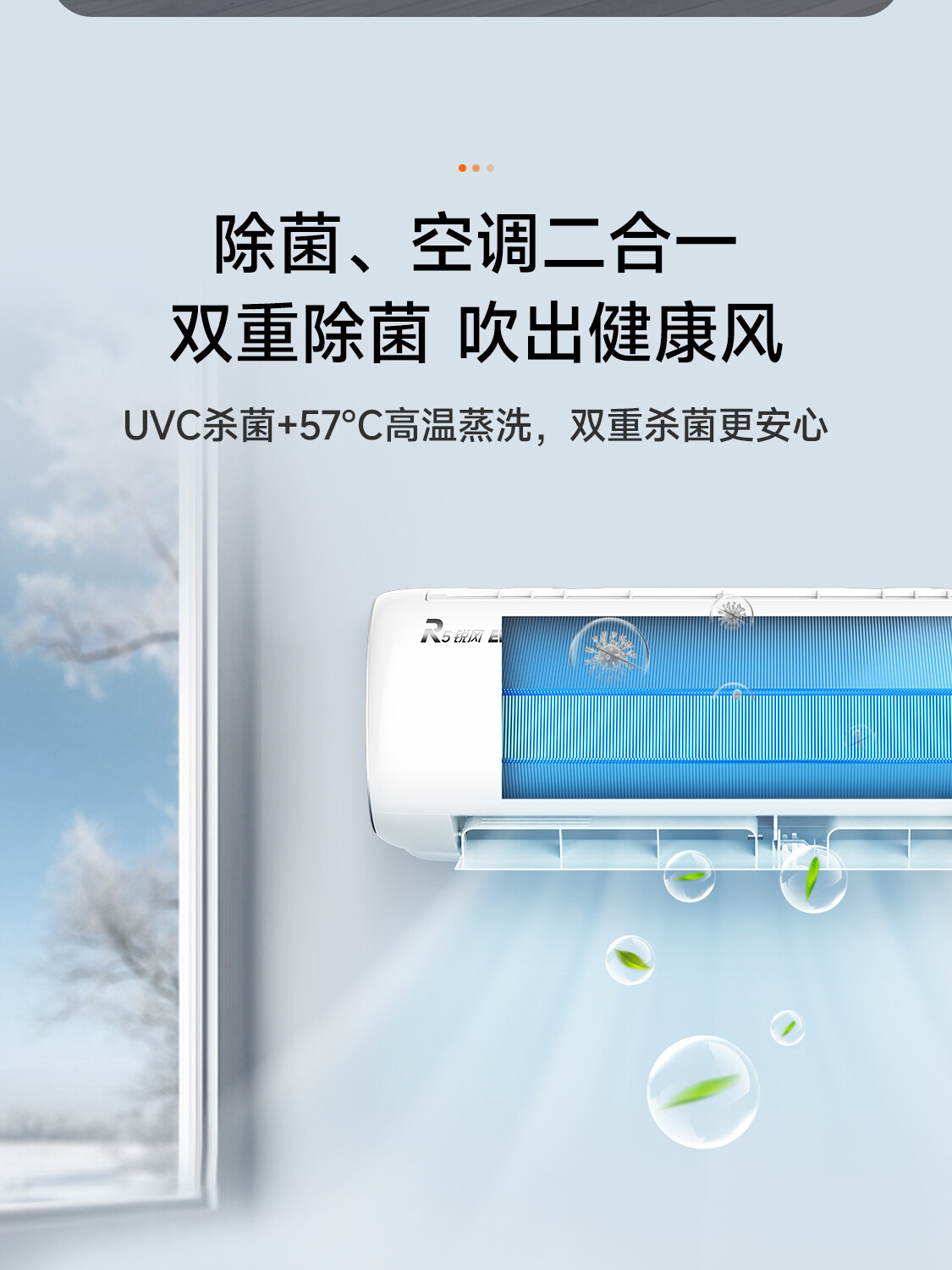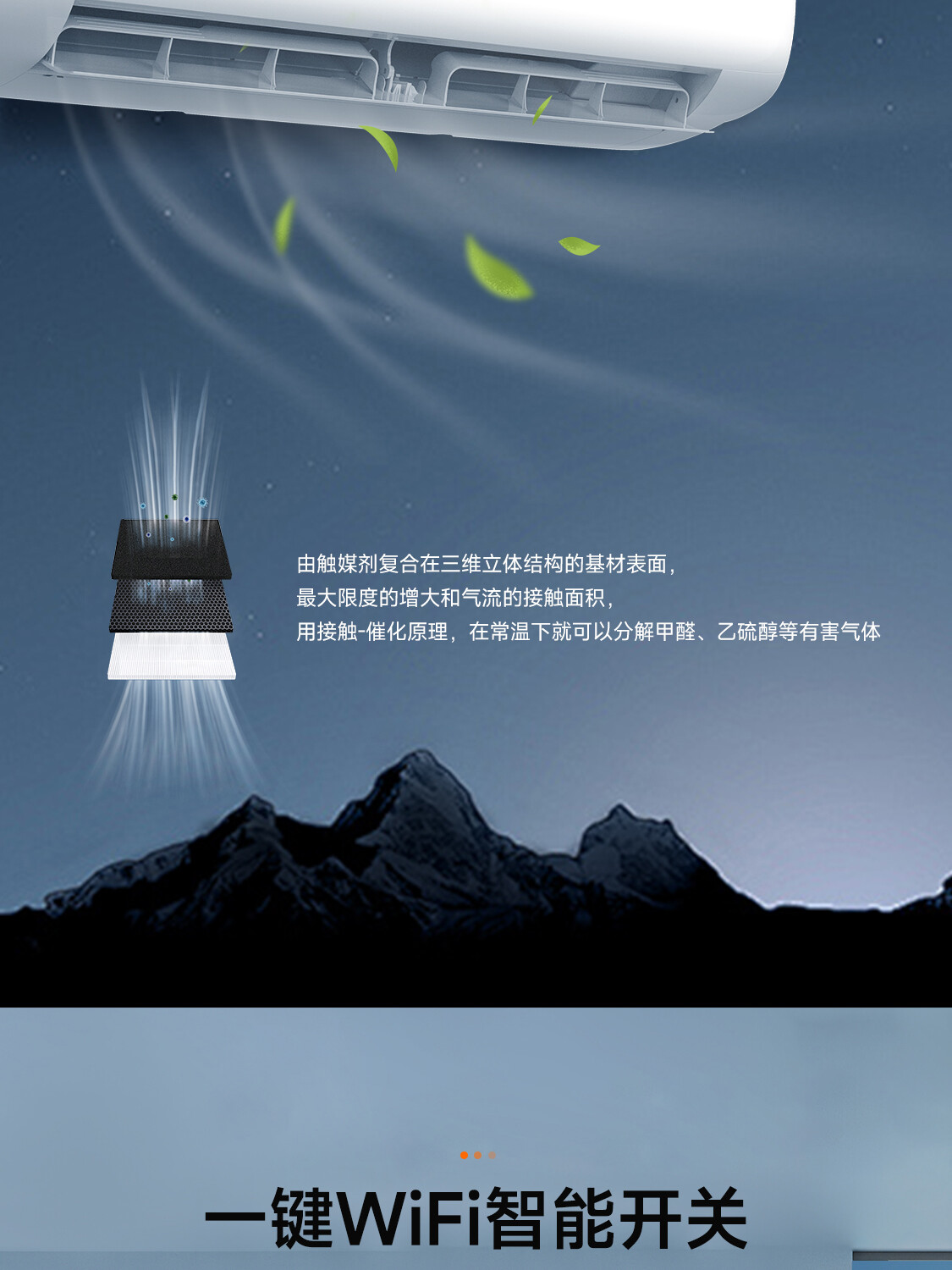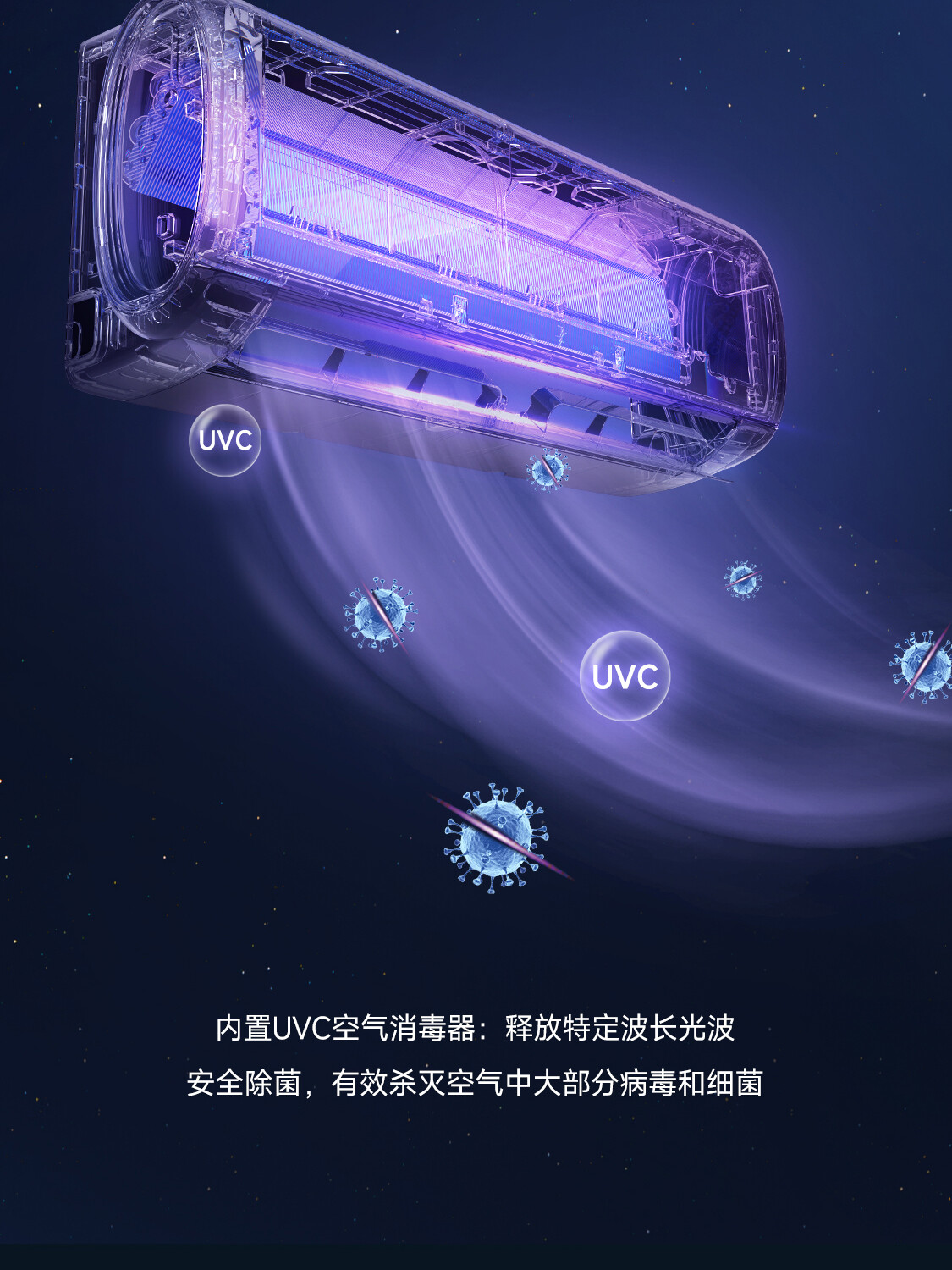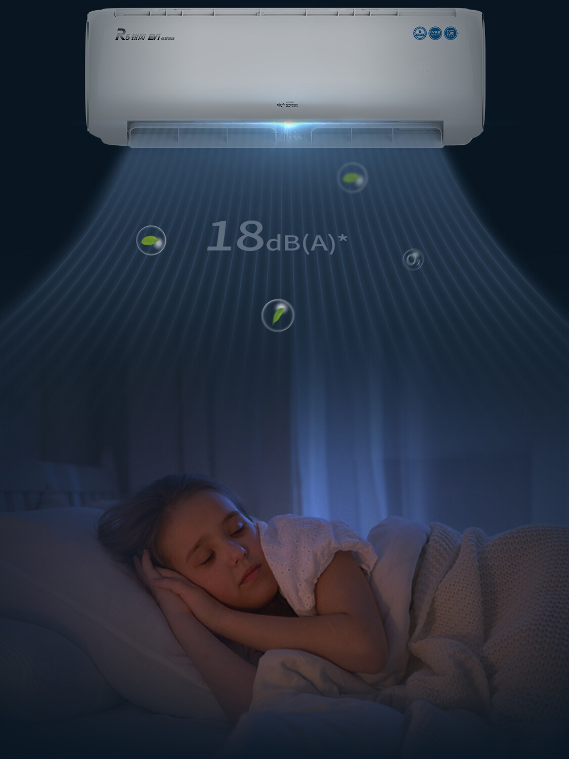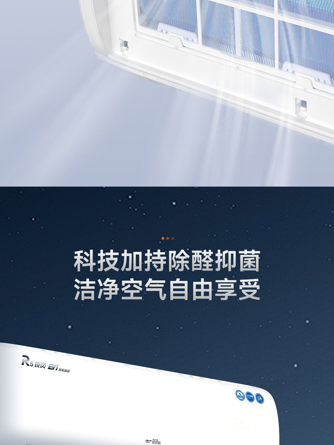 全直流变频丨新一代自清洁丨57℃高温杀菌丨新型除醛丨UVC杀菌丨独立除湿丨七档风速调节丨智能WiFi丨ECO节能丨睡眠模式